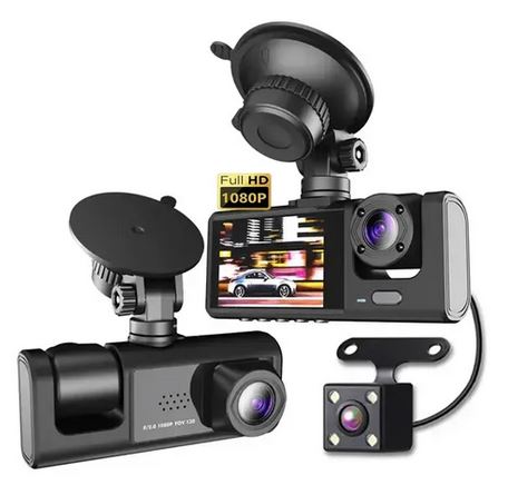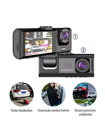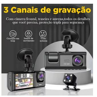 A câmera veicular DVR com três canais de gravação (frontal, interna e traseira), ideal para monitoramento completo em Full HD, mesmo em ambientes com baixa iluminação.